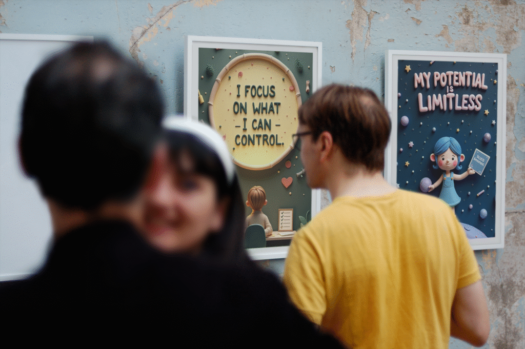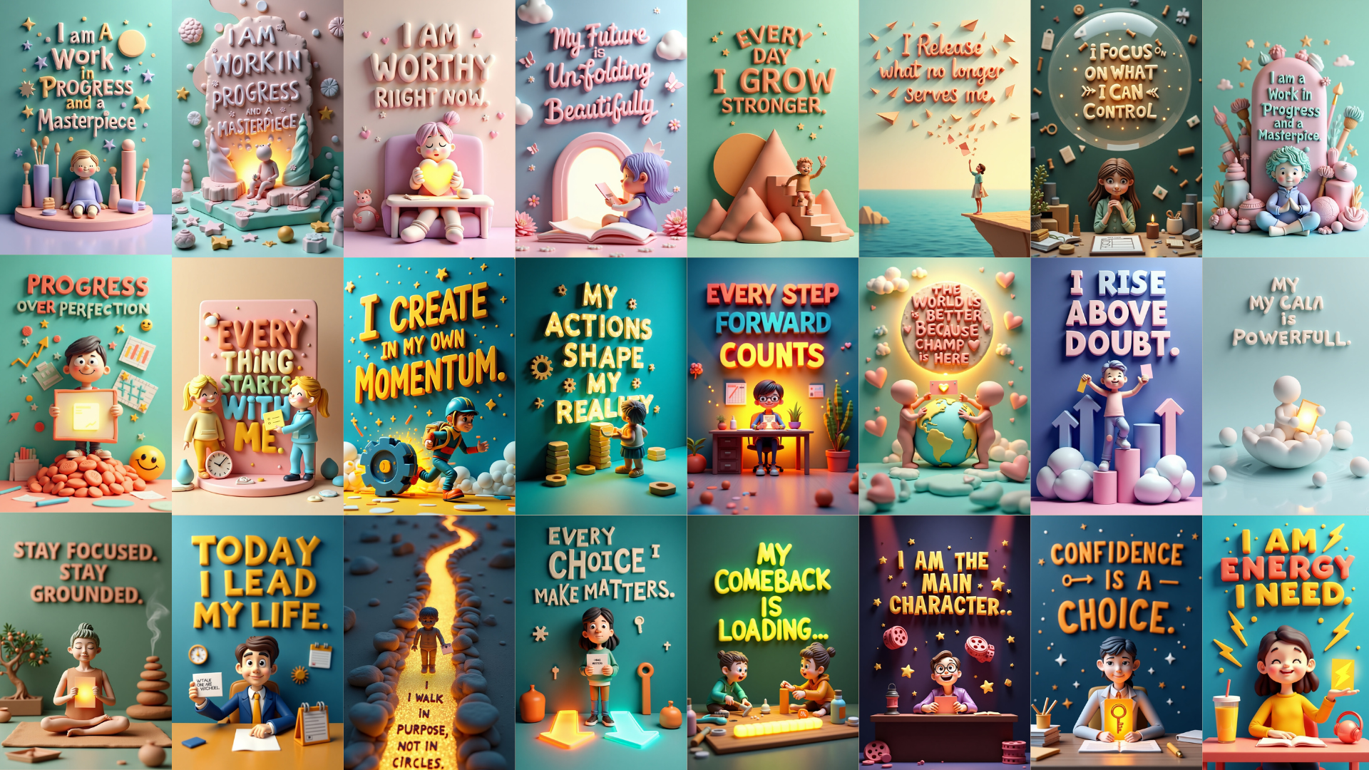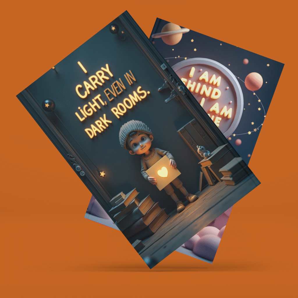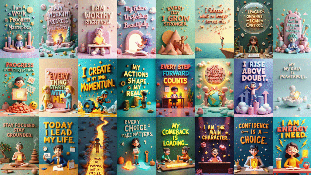 Flat text is boring. These prompts are written specifically to generate 3D-style affirmation cards with glowing elements, realistic textures, cinematic details, and elegant compositions — perfect for printing, posting, and sharing.